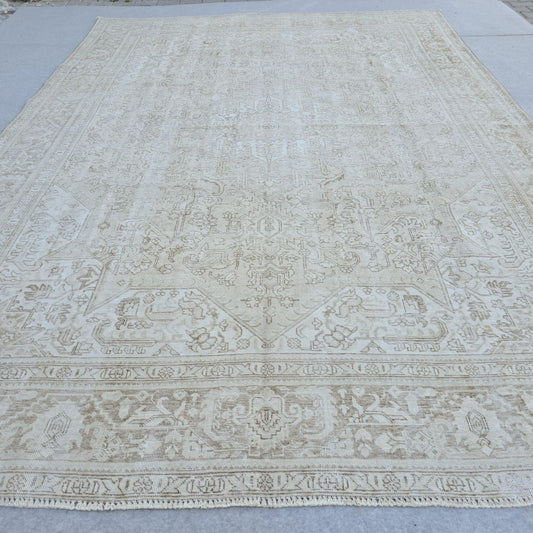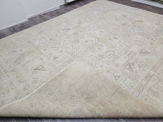 9x12 Distressed Oversize Neutral Persian Rug | Geometric Heriz Design | Hand Knotted Area Rug