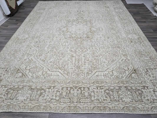 Hand Knotted 9x12 Wool Heriz Rug: Neutral Beige Brown Persian Carpet