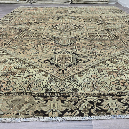 Vintage Handwoven Heriz Wool Rug 9x12: Neutral Beige Geometric Design -