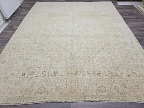 Oversized Vintage Turkish Rug 9x12: Hand-Knotted Distressed Beige Blue Rug -