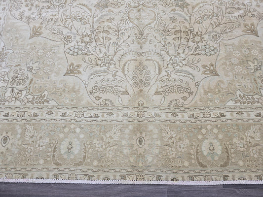 Vintage Turkish Oushak Rug 10x12: Beige Wool Floral Medallion Carpet