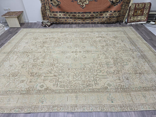 Large Neutral Turkish Wool Rug: Hand-Knotted Vintage Heriz (9.35x12.60 ft)