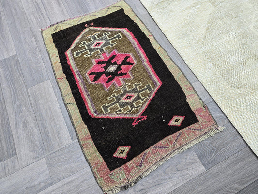 Vintage Turkish Wool Rug: Black & Pink Geometric Oushak Doormat (2x3 ft)