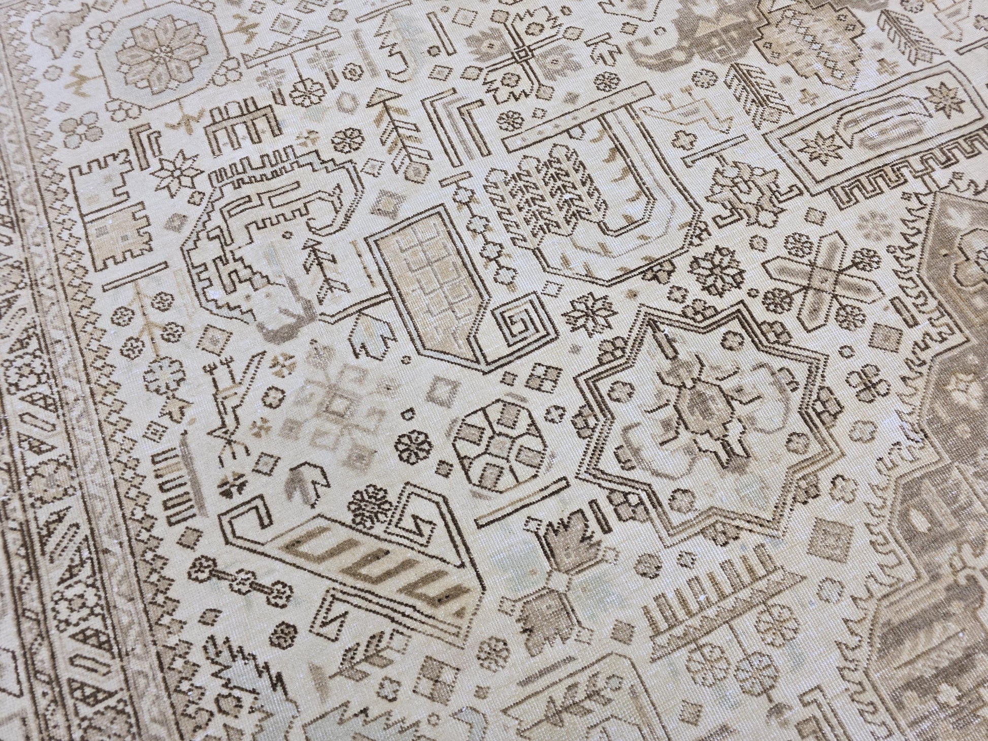 10x12 Vintage Handwoven Wool Rug: Neutral Beige Persian Heriz Style, 9'6" x 12'1"