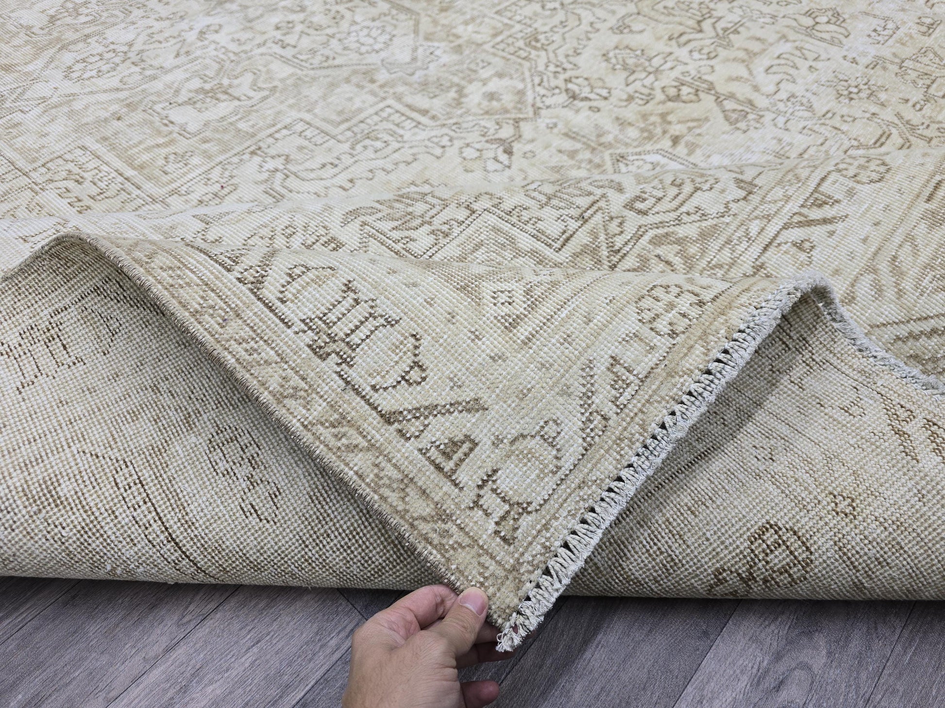 -All of my rugs are vintage. They're made using organic wool, and their beautiful colors come from the vegetable dye used by Anatolian women. The Anatolian women hand-weaved their love into each piece. While the women were weaving their rugs they designed the patterns to express their feelings at the time. Each rug is uniquely stamped with sentiments of happiness and sadness...