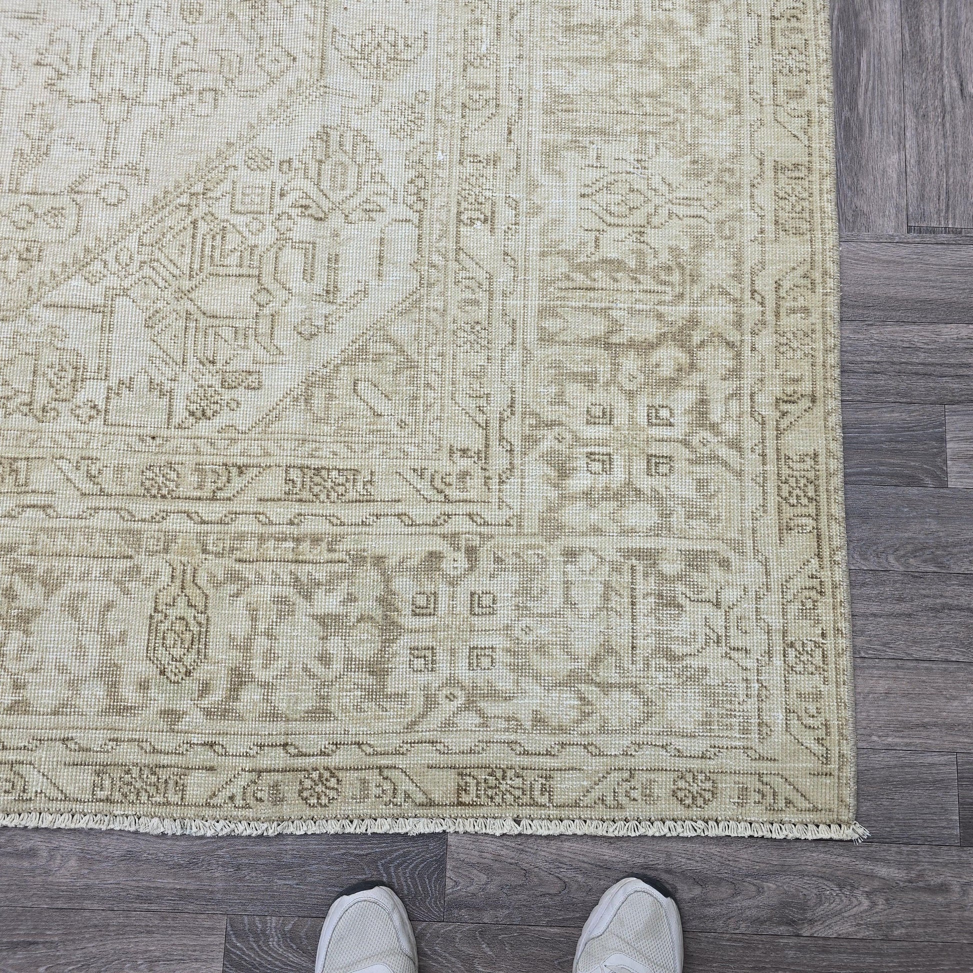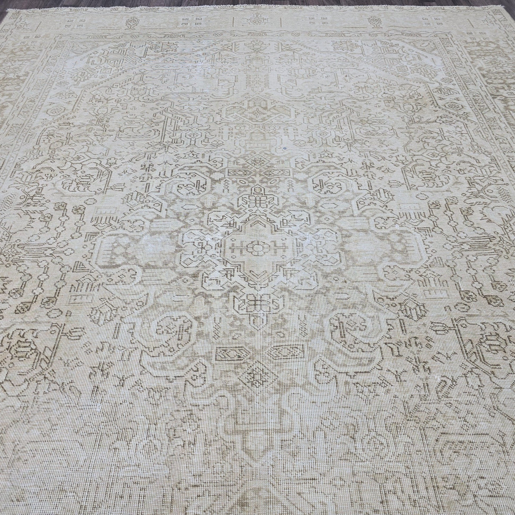 -Enhance your home with the elegance of this 9x12 Hand Knotted Wool Oushak Area Rug, a stunning blend of traditional Turkish craftsmanship and boho-chic style. Expertly hand-knotted using the double knot technique, this oversized antique rug showcases intricate patterns inspired by classic Tabriz designs. The neutral cream and beige tones effortlessly complement any décor, making it a versatile addition to both contemporary and classic interiors. Perfect for adding warmth and sophistication, this Oriental carpet is a timeless piece that brings together quality, history, and aesthetic charm.