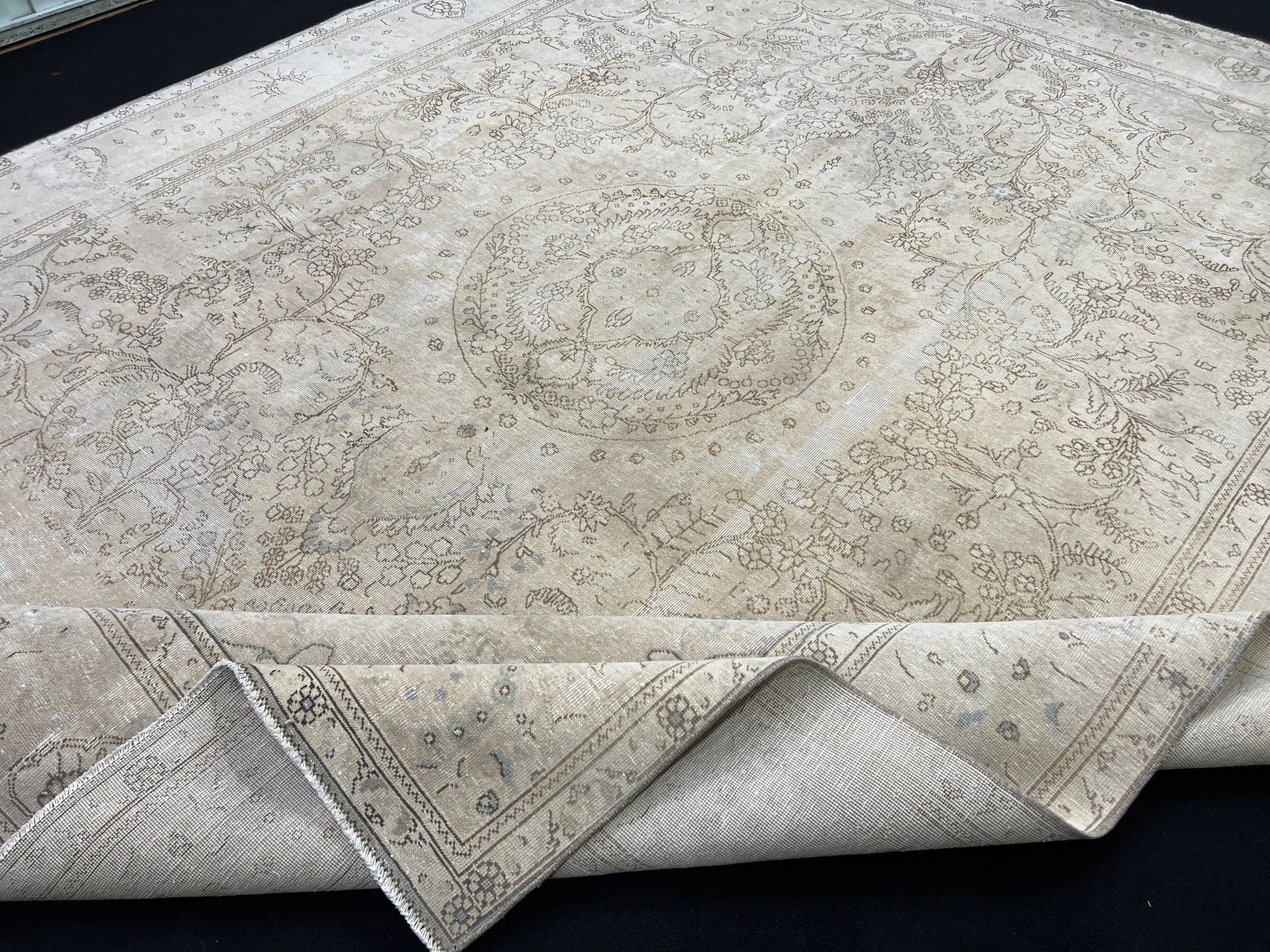 **********This oushak rug is excellent in terms of its condition. This neutral rug and all rugs in our store are washed and ready for your use. Because of its age, there may be tiny defects present.
