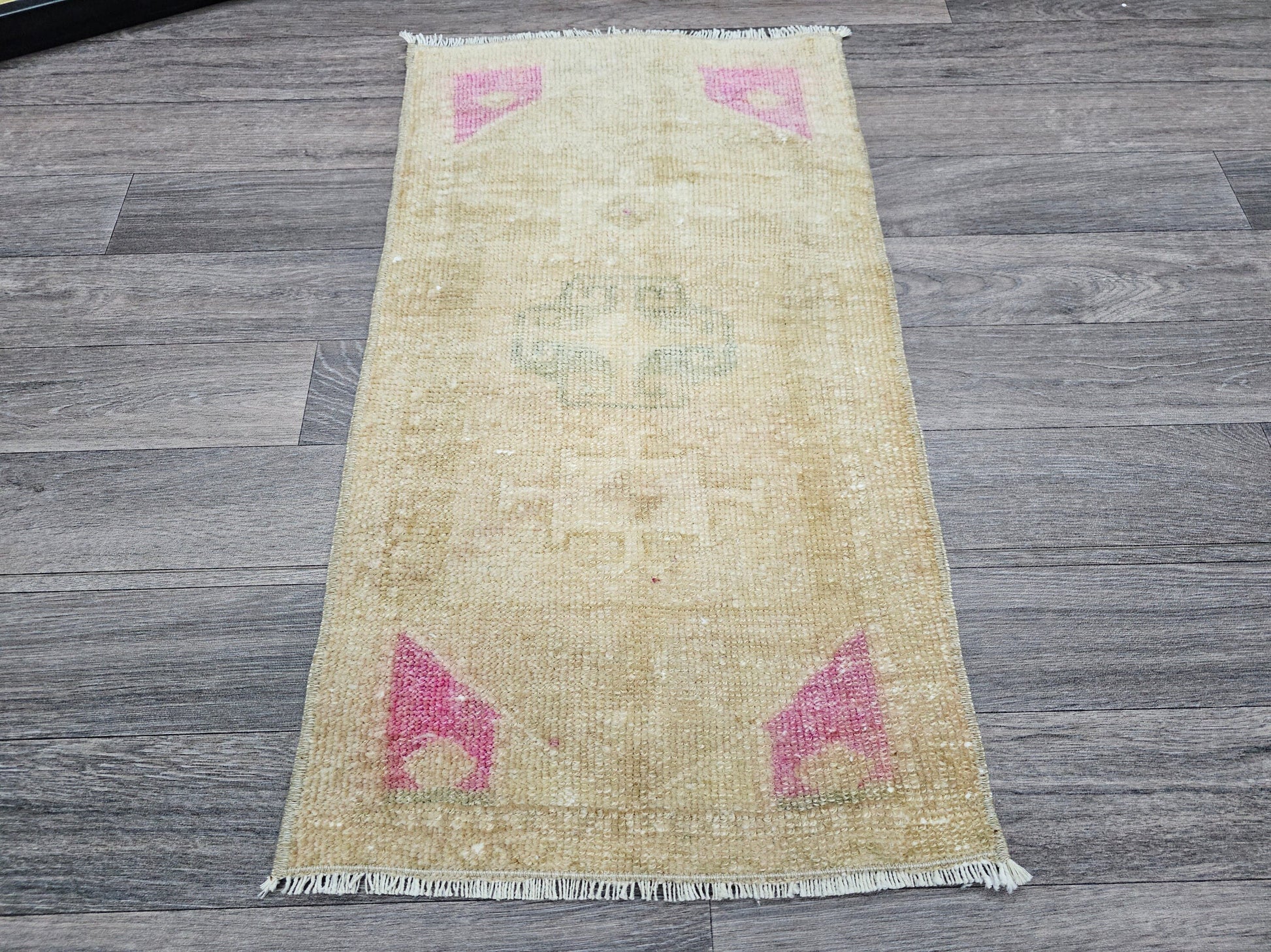 Handwoven Turkish Wool Rug: Vintage Boho Bath Mat (17x31 inches)