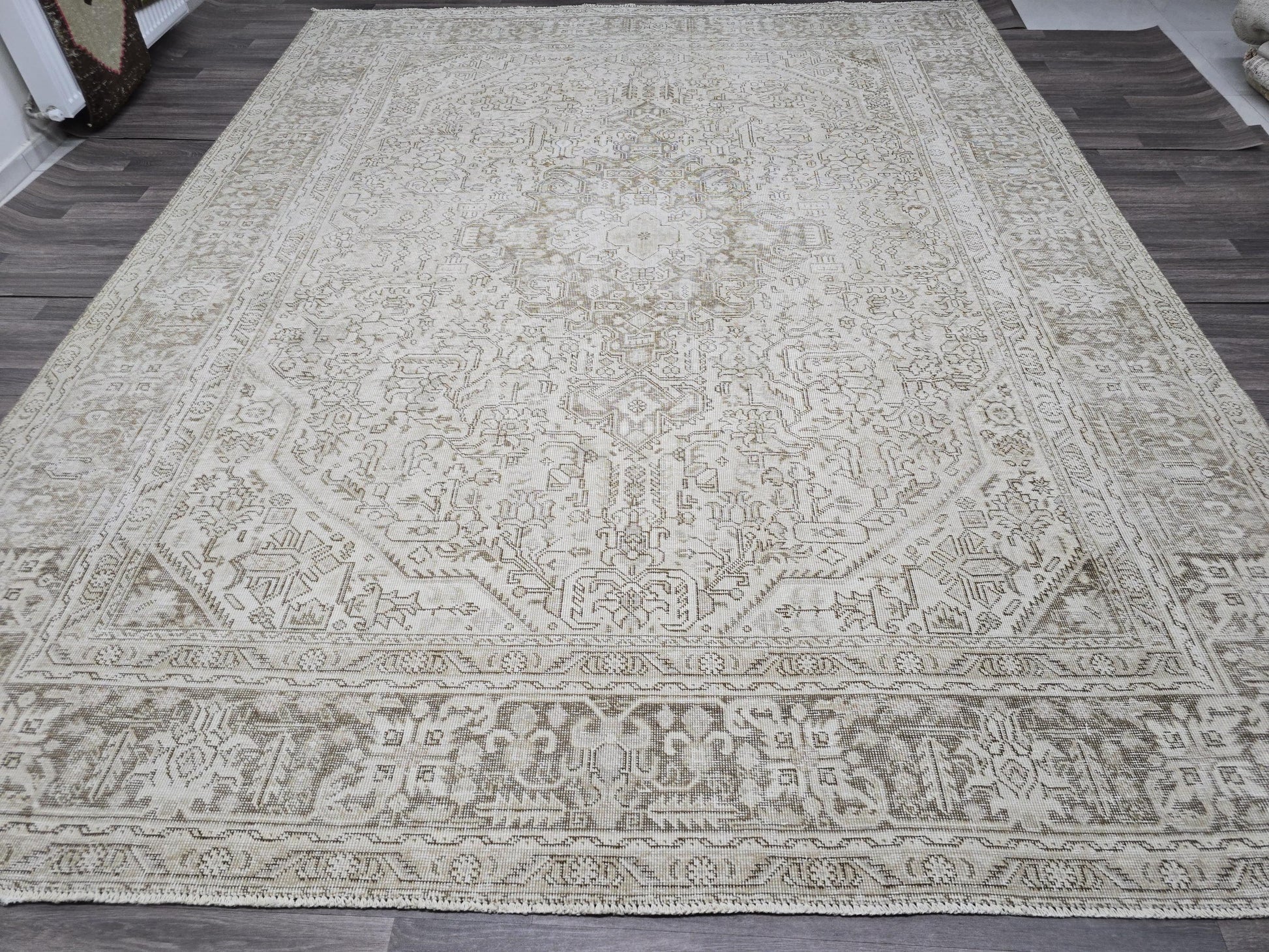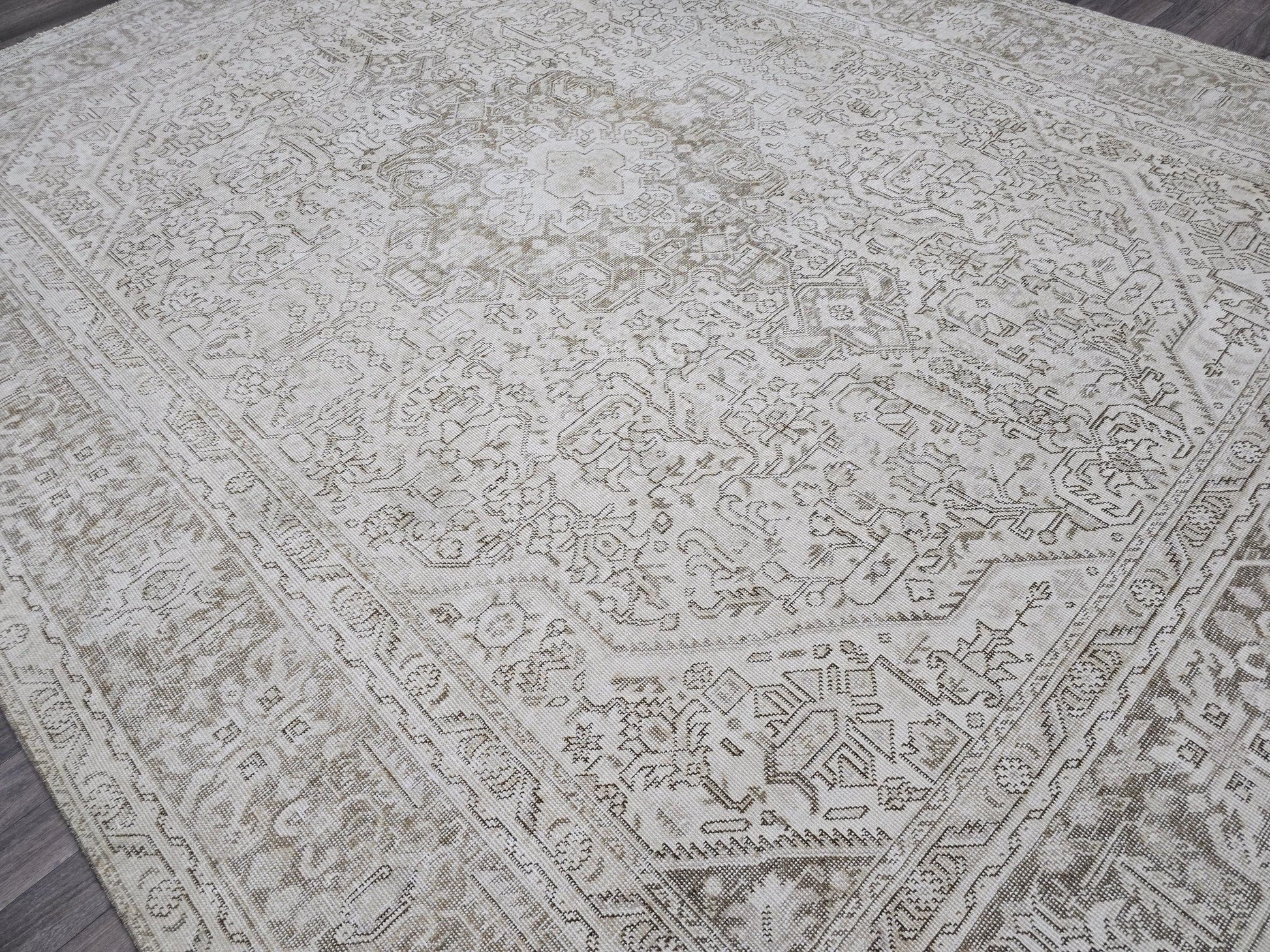 Oversize Neutral Heriz Rug 9x12: Hand-Knotted Wool, Beige Tan Geometric Carpet