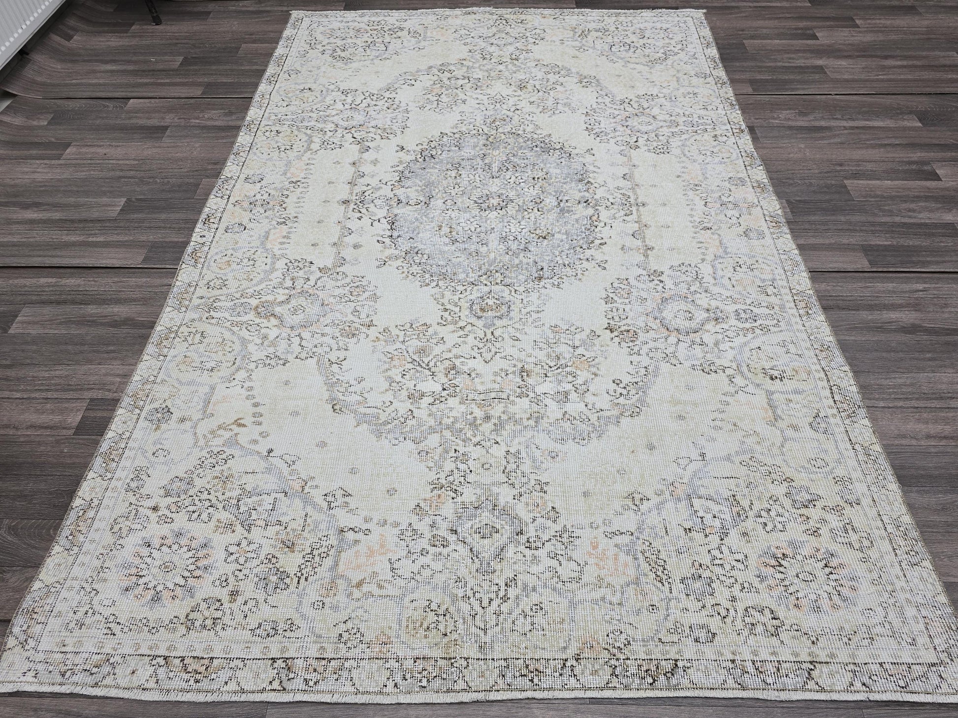 🏺 Authentic vintage Persian-style area rug handwoven with natural wool, featuring an elegant medallion design in cream and soft gray tones.