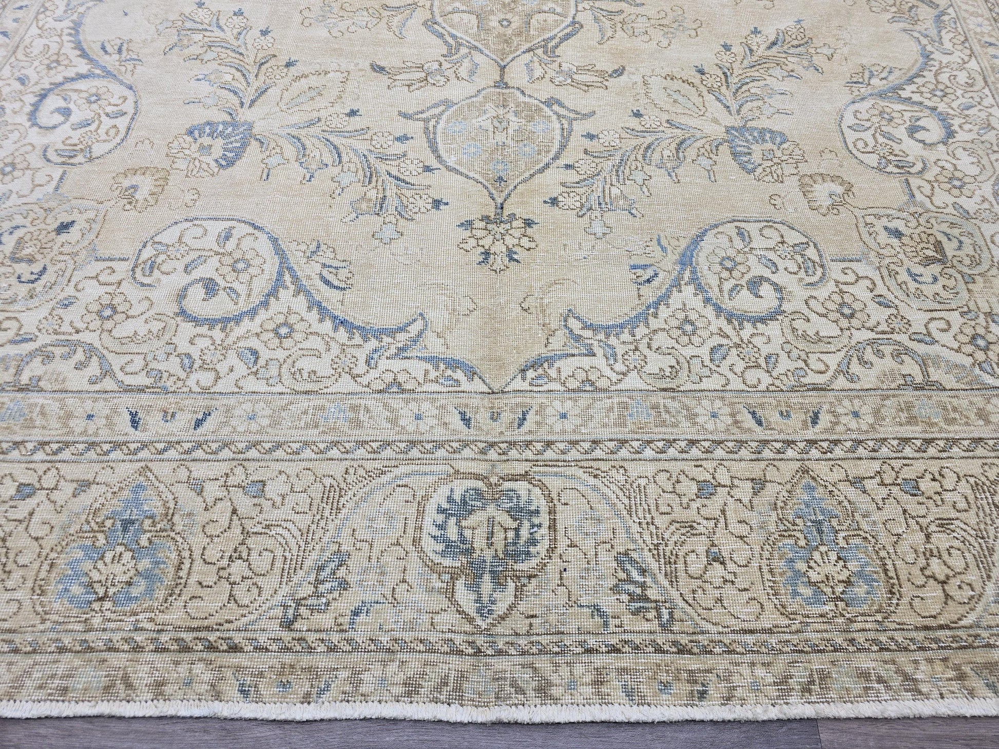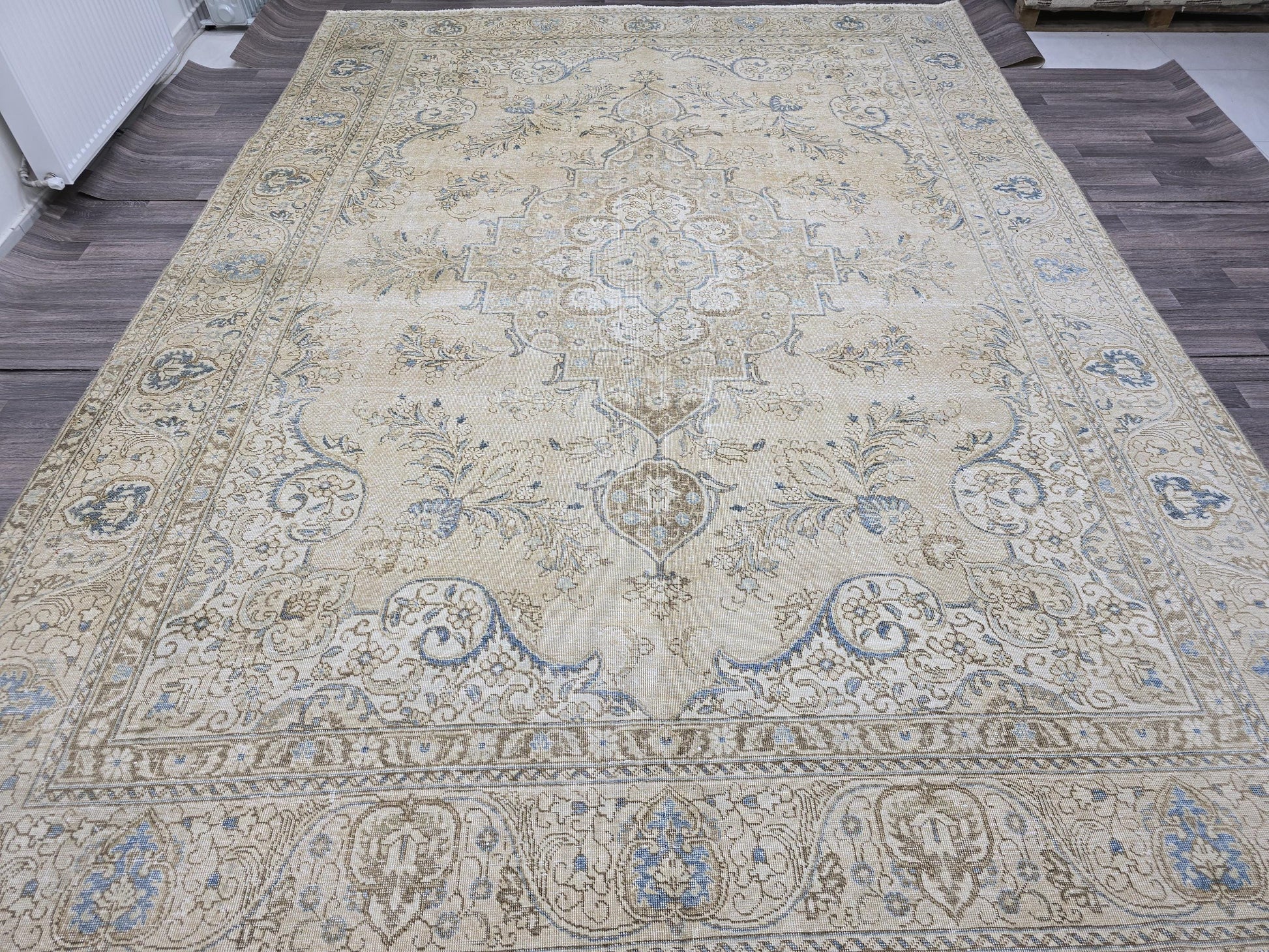 🏺 Authentic vintage Turkish Oushak rug, handknotted with 100% natural wool featuring elegant floral medallion design in muted beige and blue tones.