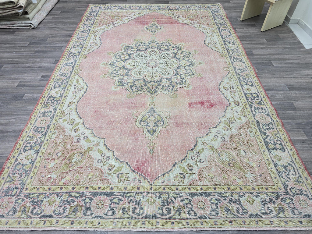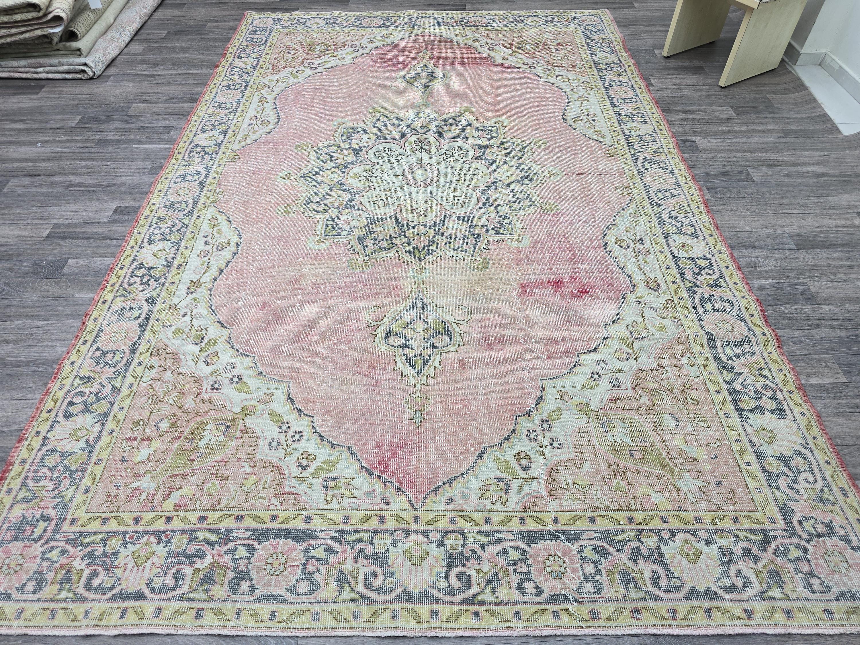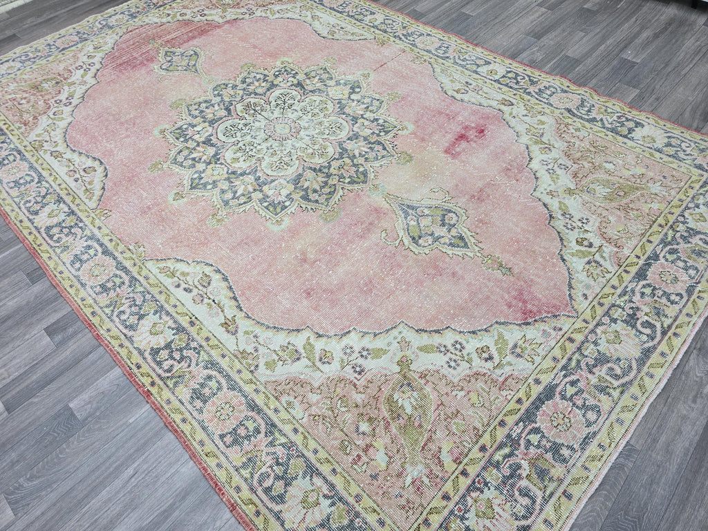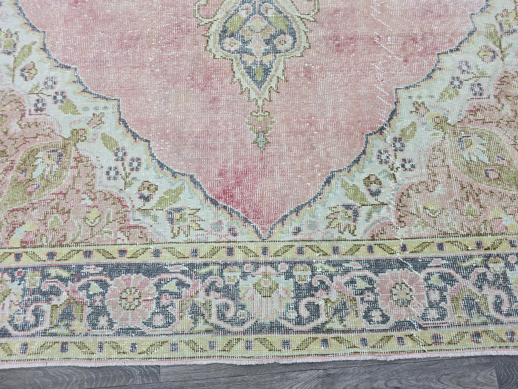🏺 Authentic vintage Turkish Oushak rug with a stunning floral medallion design in soft pink and pastel colors.