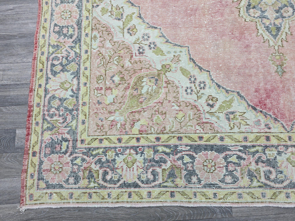 Vintage Turkish Oushak Rug: 7x11 Pink Floral Wool Carpet