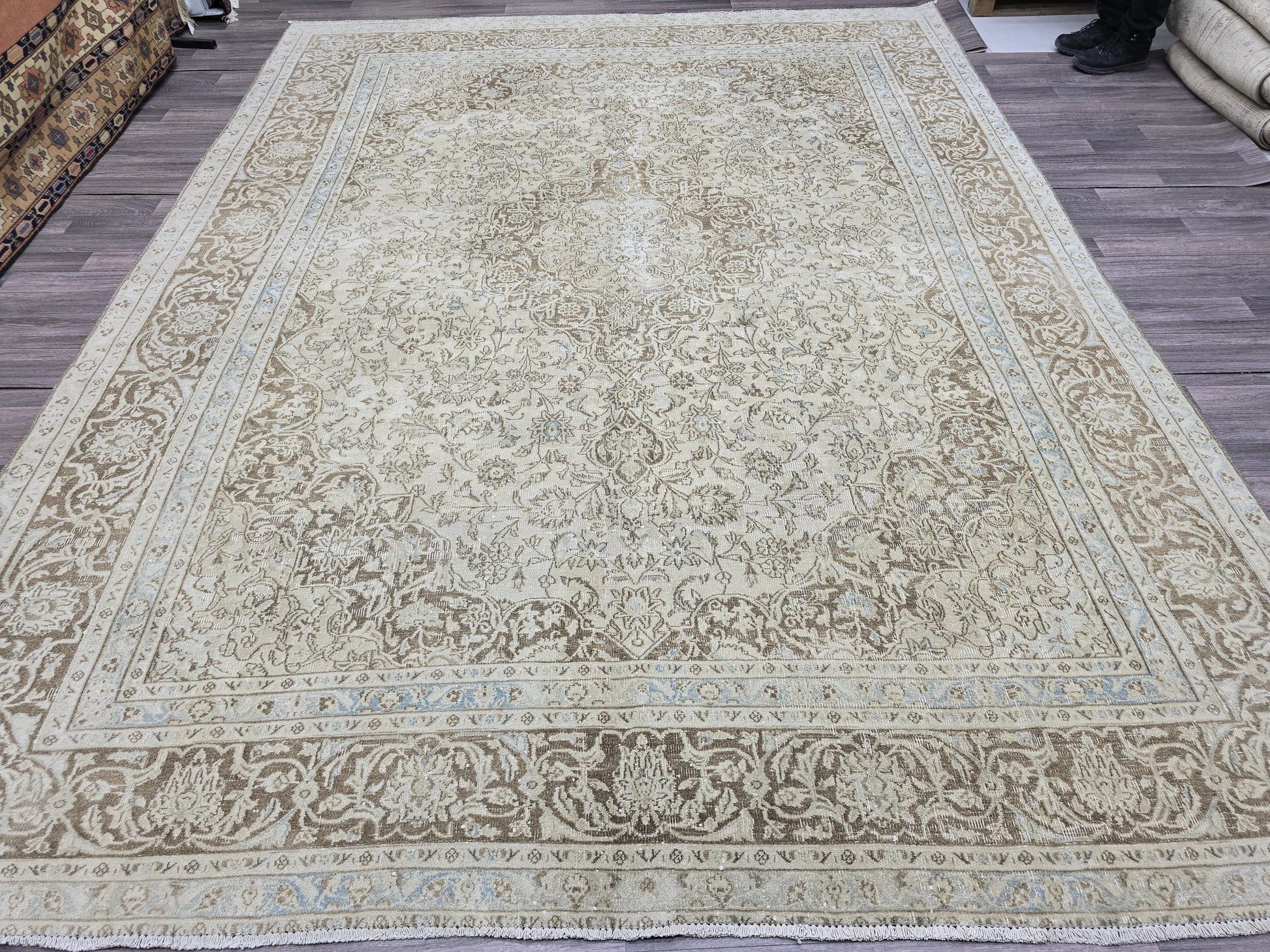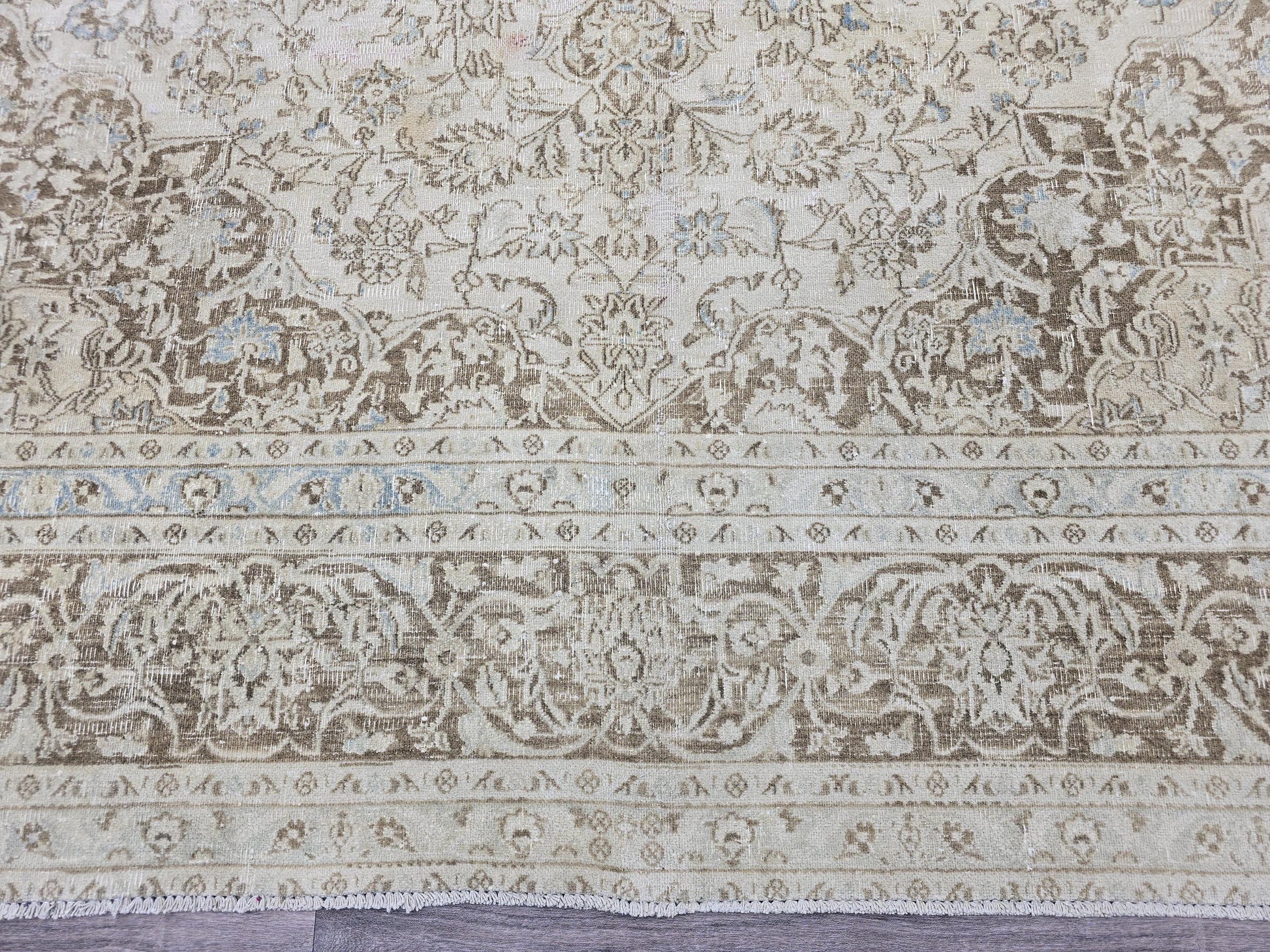 🏺 Authentic vintage Turkish Oushak rug with elegant floral design and traditional border pattern. Perfect blend of beige and cream tones with subtle light blue accents.