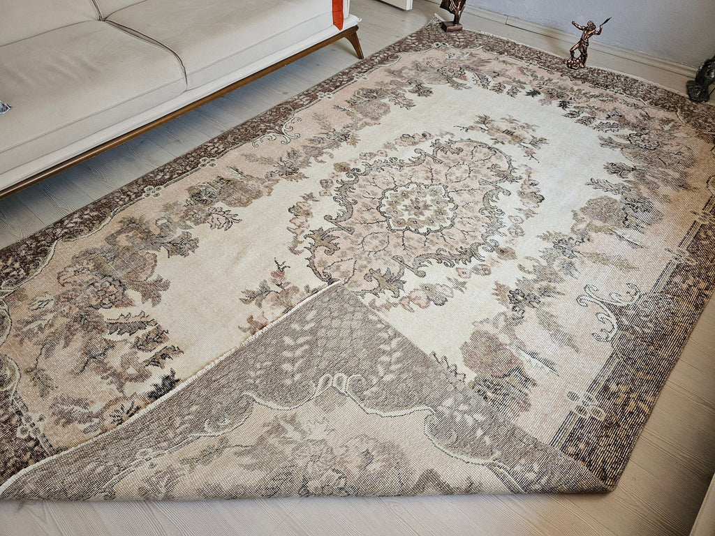 **********This rug is excellent in terms of its condition. This neutral rug and all rugs in our store are washed and ready for your use. Because of its age, there may be tiny defects present.