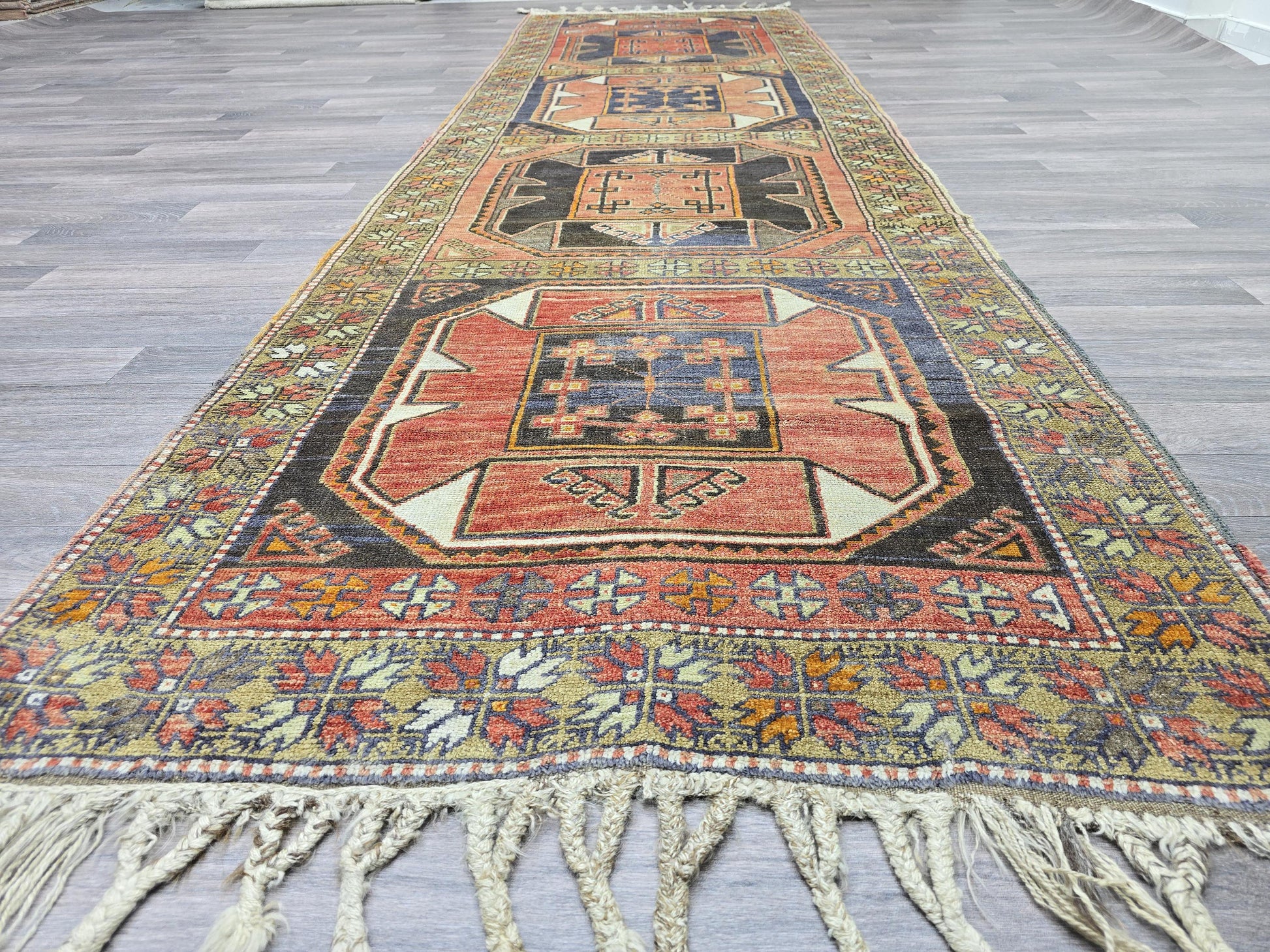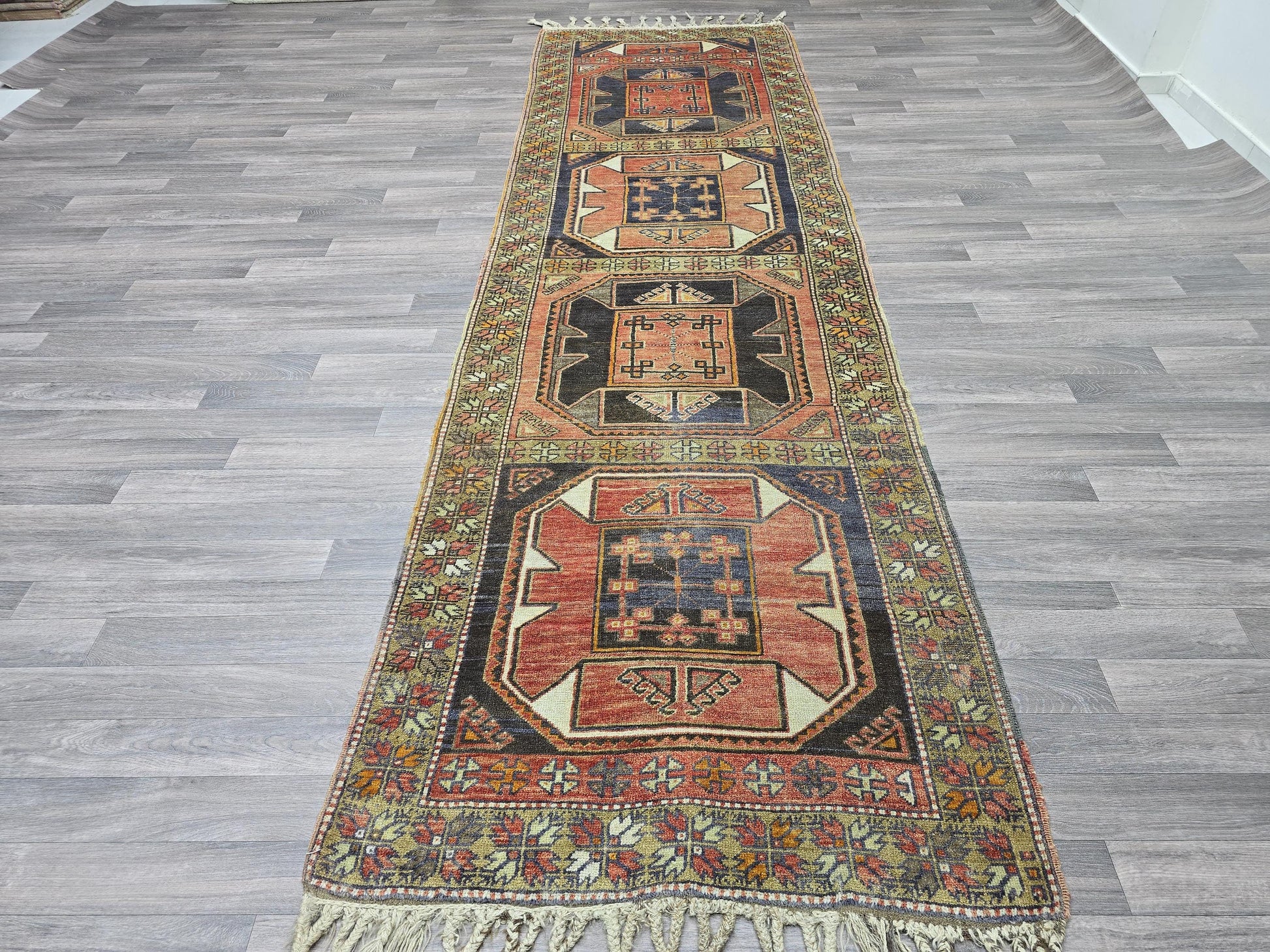 Vintage Turkish Runner Rug: Handknotted Wool Hallway Carpet, 3.4x11.5 ft