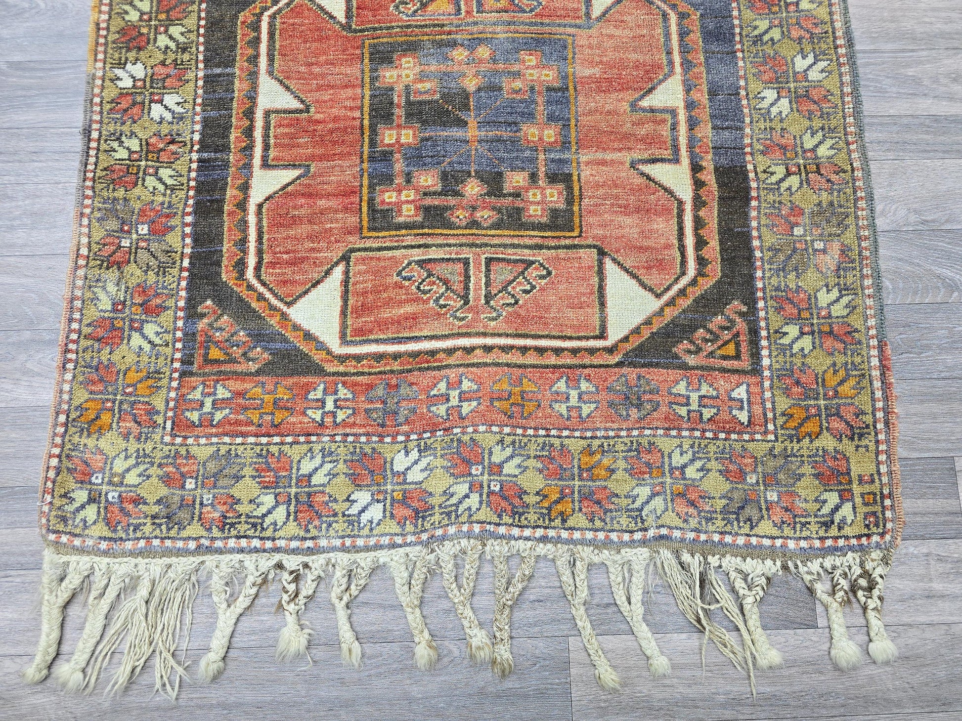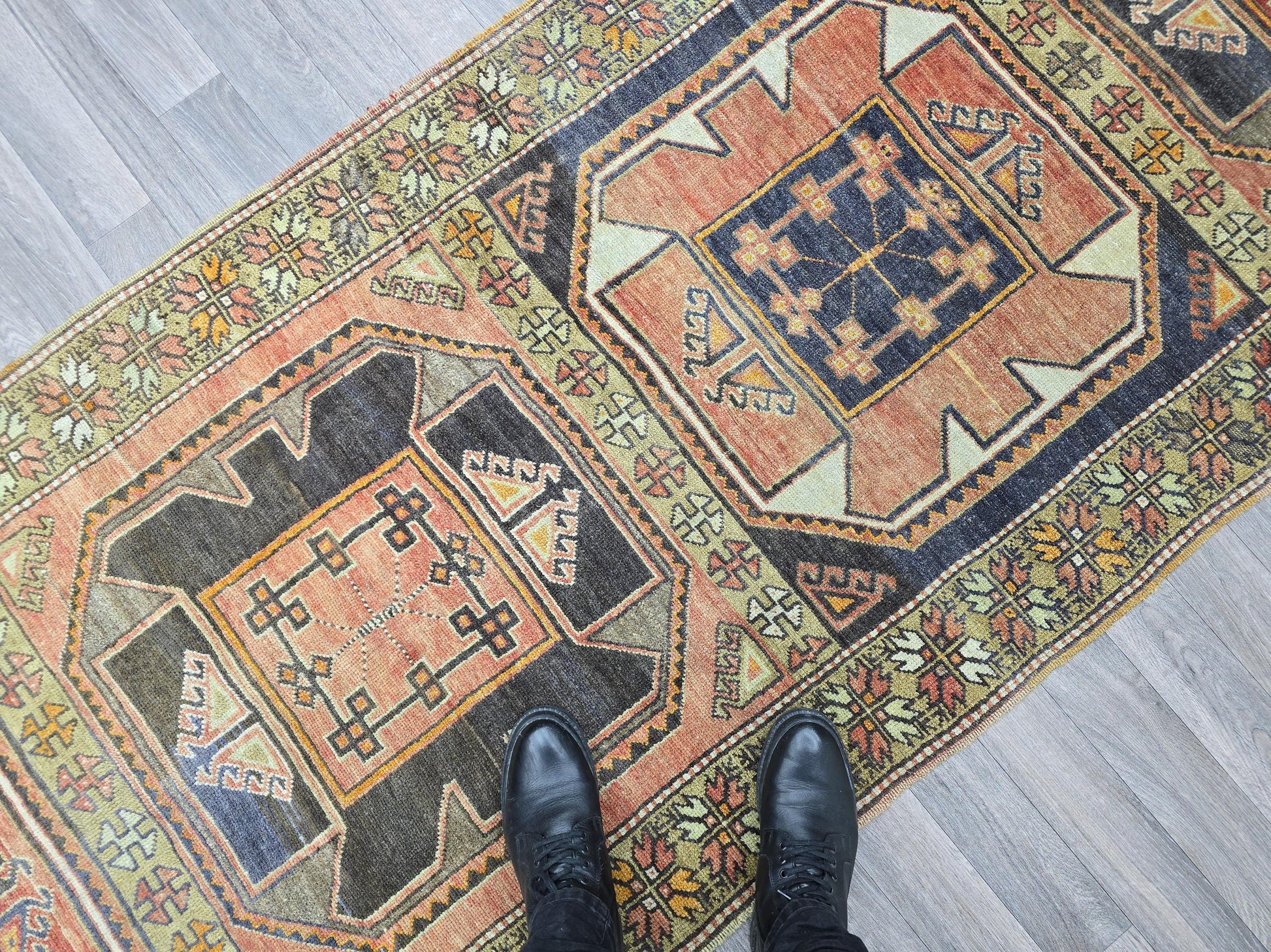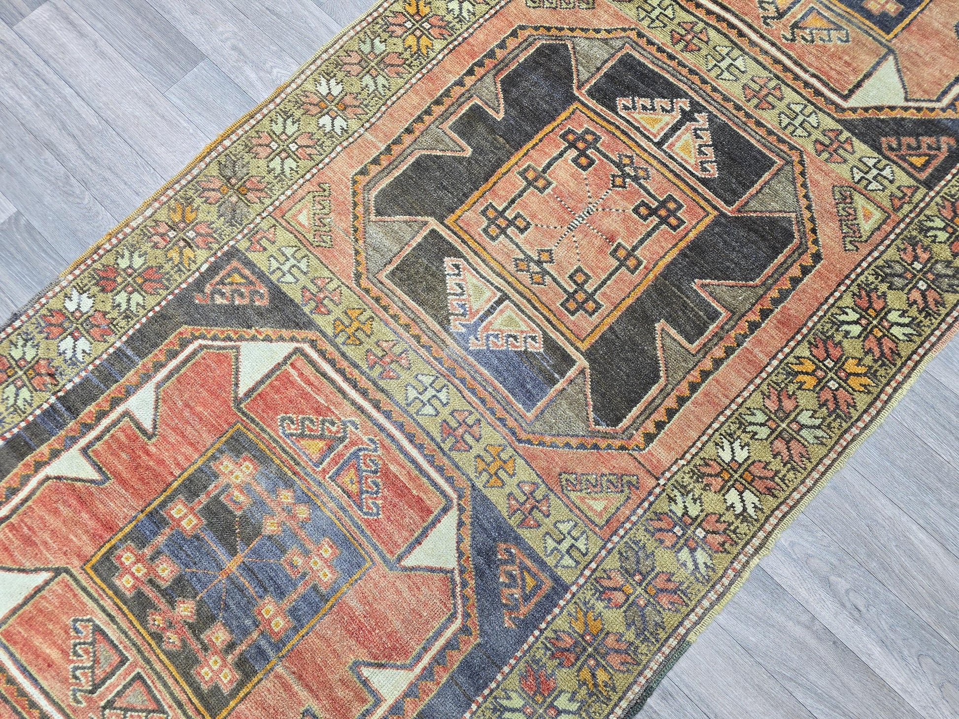 🏺 Experience the timeless beauty of this authentic vintage Turkish runner rug, masterfully handknotted using the double-knot technique with 100% wool on wool foundation. This durable and long-lasting piece has been professionally cleaned and is ready to enhance your space with its rich heritage and stunning craftsmanship. The rug features a beautiful combination of orange, navy, and sage green colors in a mesmerizing geometric pattern.